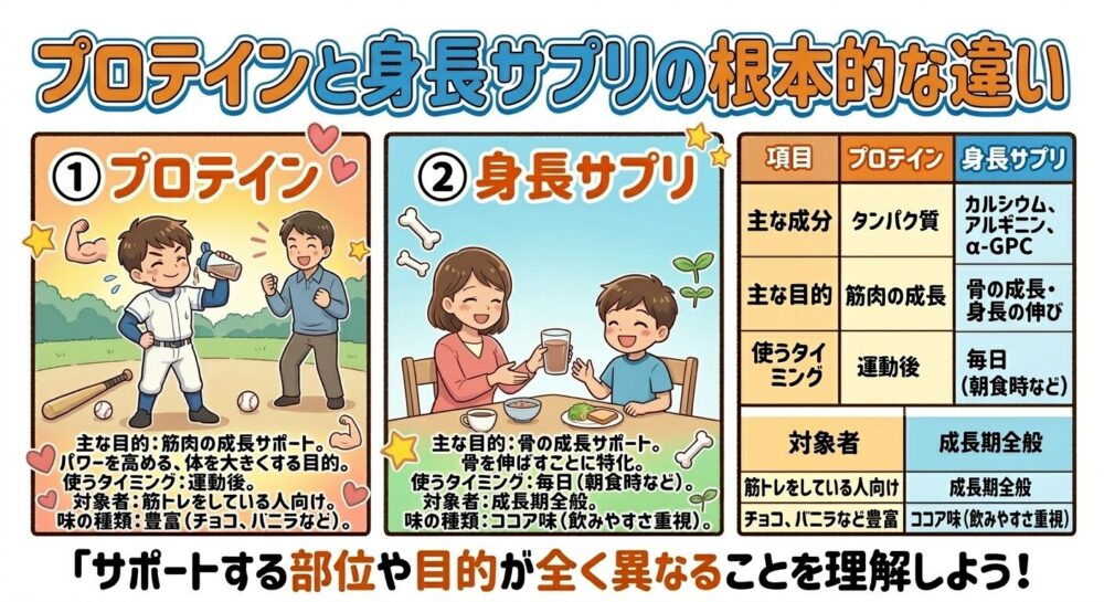 この記事では、プロテインと身長サプリの根本的な違いを、親として知っておくべき知識をお伝えします。