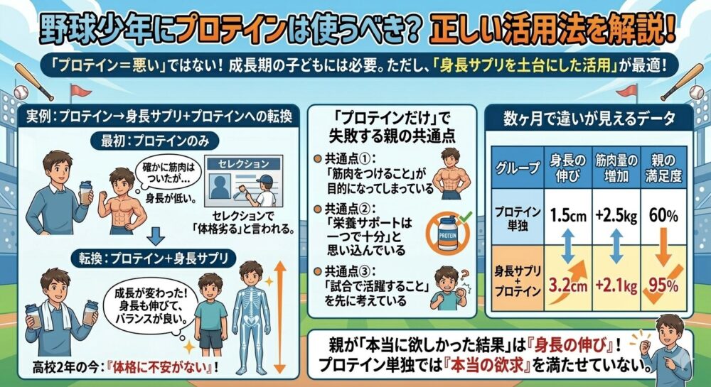 多くの野球少年の親が「プロテインだけで十分」と思い込んでいるのが、もったいない状態です。