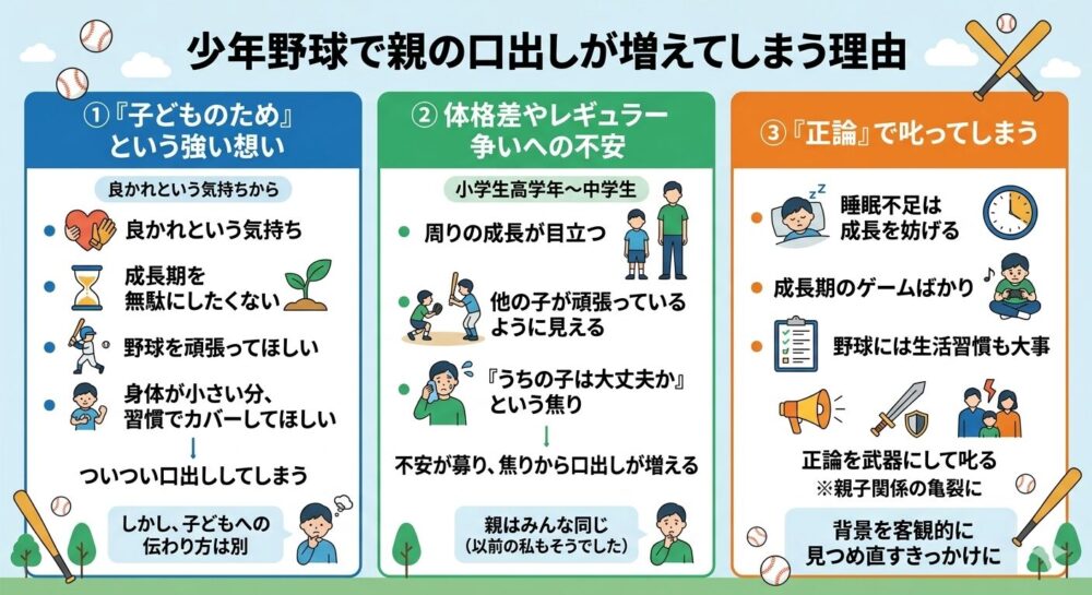 少年野球の親が口出しをするのは、多くの場合、子どもへの良かれという気持ちからです。