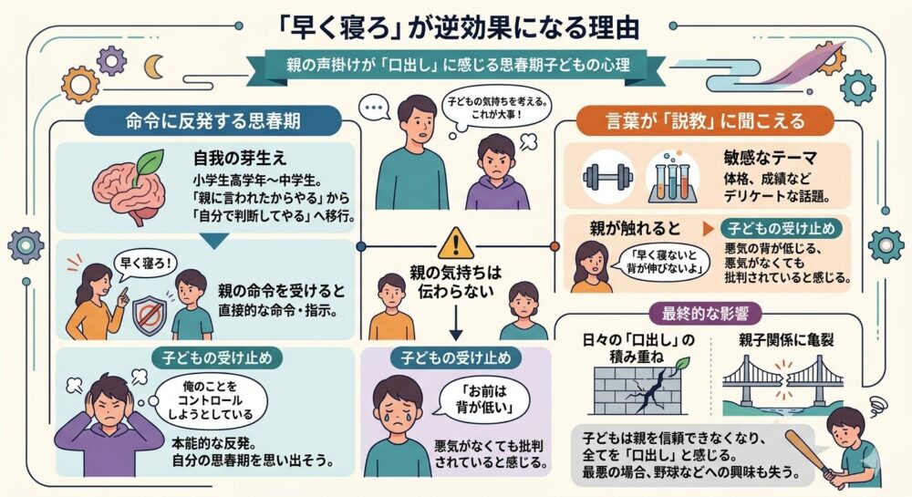 「早く寝ないと背が伸びないよ」という言葉も、子どもの耳には「お前は背が低いから何とかしろ」という批判に聞こえてしまうのです。